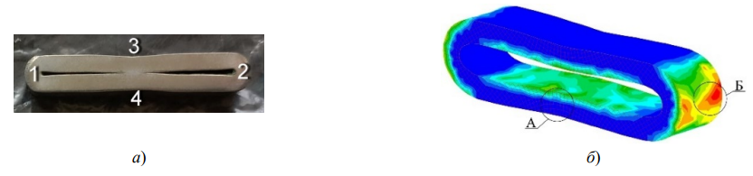 Это можно объяснить тем, что напряженно-деформированное состояние материала зависит от конфигурации заготовок до и после радиальной осадки. В зоне А (3 и 4) материал в результате пластической деформации (наклепа) упрочняется лучше, чем в зонах растяжения Б (1 и 2) (рис. 3 б).