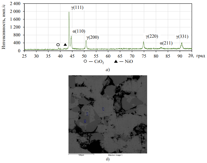 Рис. 8. Фазовый состав и микроструктура образцов перед холодной штамповкой в спеченной стали из порошка ВП 304.200.30: а — дифрактограмма; б — распределение хрома, никеля и других элементов