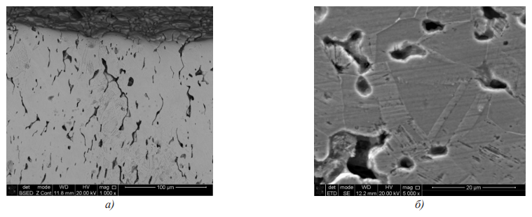 Микроструктуру исследовали на металлографическом микроскопе Altami MET-1M и растровом электронном Quanta 200. Электронно-зондовые изыскания выполняли на растровом электронном микроскопе Tescan VEGA II LMU. Рентгенофазовый анализ проводили на рентгеновском дифрактометре XRD-6100 с вертикальным гониометром θ–2θ.