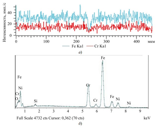 Рис. 9. Распределение химических элементов в спеченной стали из порошка ВП 304.200.30: а — линейное распределение Cr и Fe; б — спектральный анализ Cr, Ni и др. элементов