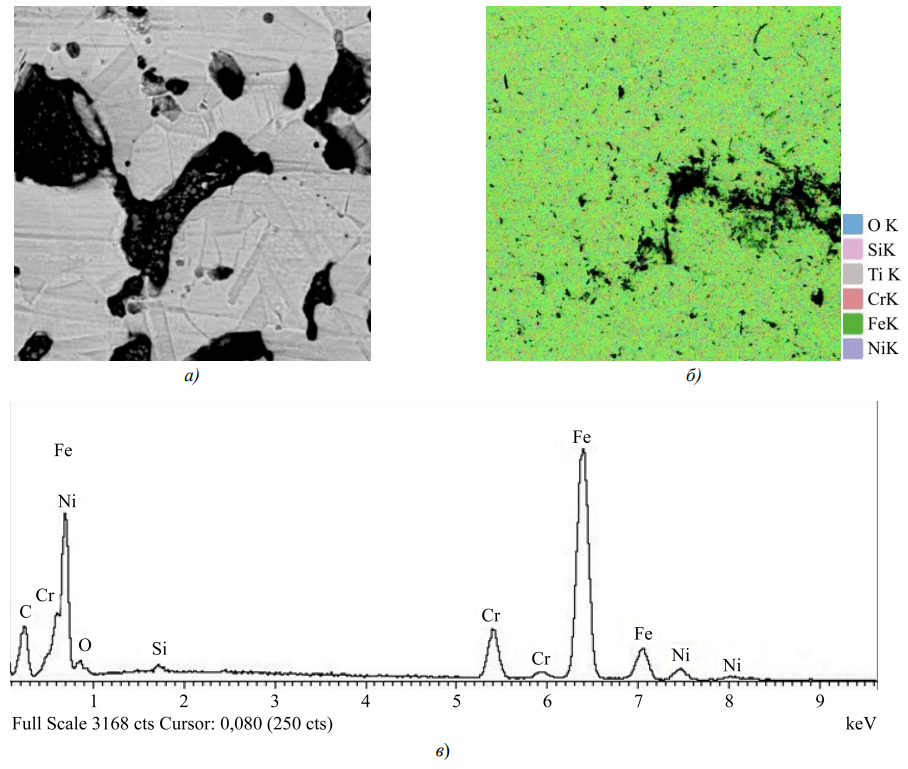 Рис. 5. Картирование спеченной хромоникелевой стали ВП 304.200.30: а — микроструктура; б — распределение Cr; в — распределение Ni