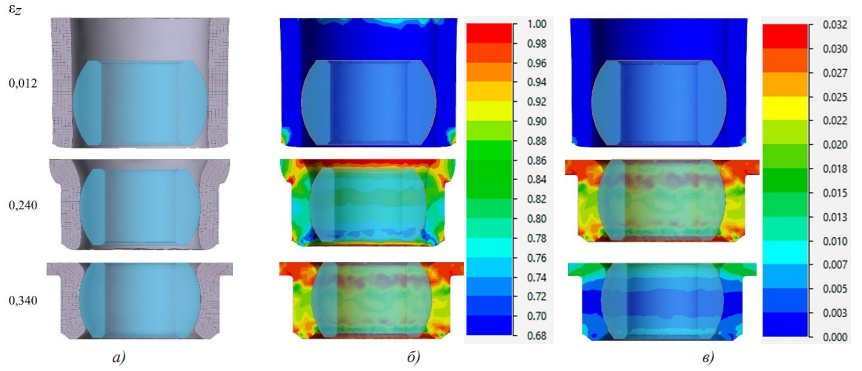 Рис. 11. Имитационное моделирование кинетики формования наружной обоймы с фланцем пористой заготовки в программе QForm: а — изменение координатной сетки; б — распределение по объему относительной плотности; в — ресурс пластичности