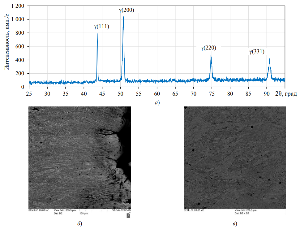 Рис. 7. Фазовый анализ и микроструктура катаной стали 10Х18Н9: а — дифрактограмма после радиального обжатия; б — микроструктура колец в зоне сжатия; в — микроструктура в зоне растяжения после осадки εR = 63 %