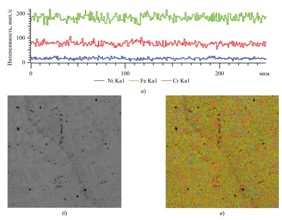 Рис. 6. Картирование стали 10Х18Н9: а — распределение Cr и Ni; б, в — микроструктура