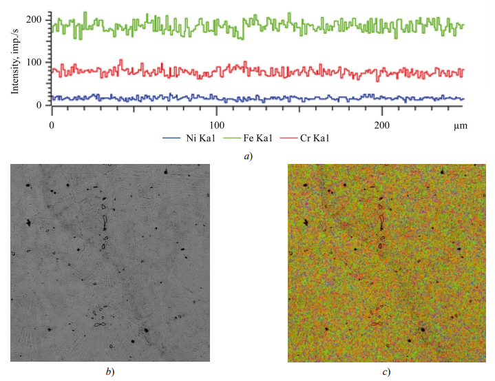 Fig. 6. Mapping of 10Kh18N9 steel: a — distribution of Cr and Ni; b, c — microstructure