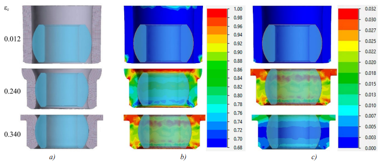 Fig. 11. Simulation modeling of the kinetics of forming an outer cage with a flange of a porous blank in the QForm program: a — change in the coordinate grid; b — volume distribution of relative density; c — plasticity resource