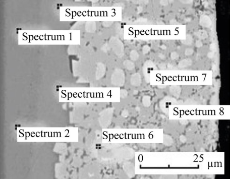 There was no molybdenum in points 1 and 2. Next, a transition zone of a solid molybdenum solution was formed, containing about 3% Mo. The thickness of the diffusion layer was 50–55 µm. It consisted of a base (spectra 5, 6) with rounded inclusions located in it (spectra 7, 8). As can be seen from Table 1, the base contained approximately 47% Mo, and therefore it could be an intermetallic Fe3Mo2 or carbides (Fe,Mo)3C [15, 16]. The inclusions (spectra 7, 8) contained approximately 94% Mo, which corresponded to the carbide phase Mo2C [16, 17].