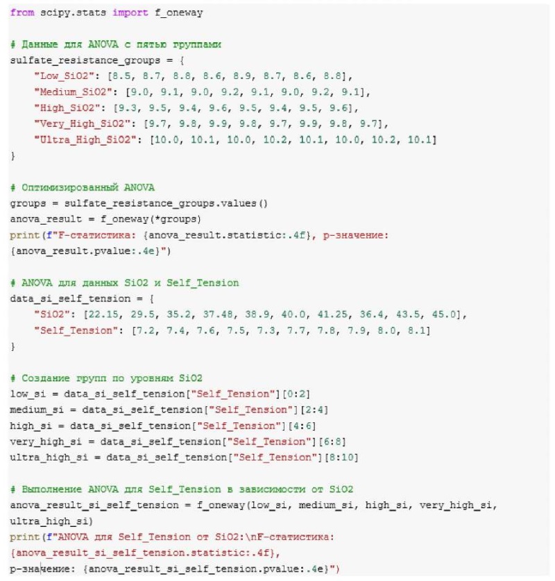 Materials and Methods. The data sources were thematically structured and analyzed. Experiments were conducted on eight compositions in accordance with patent RU 2079458 C1 and standards GOST 310.1.76 and GOST 310.4.81. The samples were grouped by SiO2 levels. ANOVA and linear regression were used to model the dependence of sulfate resistance and self-stress on SiO2 content.
