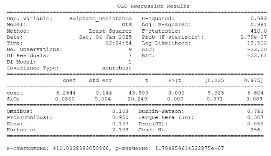 The regression model described in the article showed accuracy in predicting the sulfate resistance of cements depending on the SiO2 content (21–44%). This was confirmed by the analysis of variance. The author focuses on the SiO2 content as a key factor for increasing sulfate resistance. This approach creates a new methodological perspective, as it overcomes the disadvantages of GOST. The standard focuses on С3А and basicity and does not explicitly single out the SiO2 level as a significant parameter of the processes under consideration.
