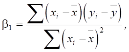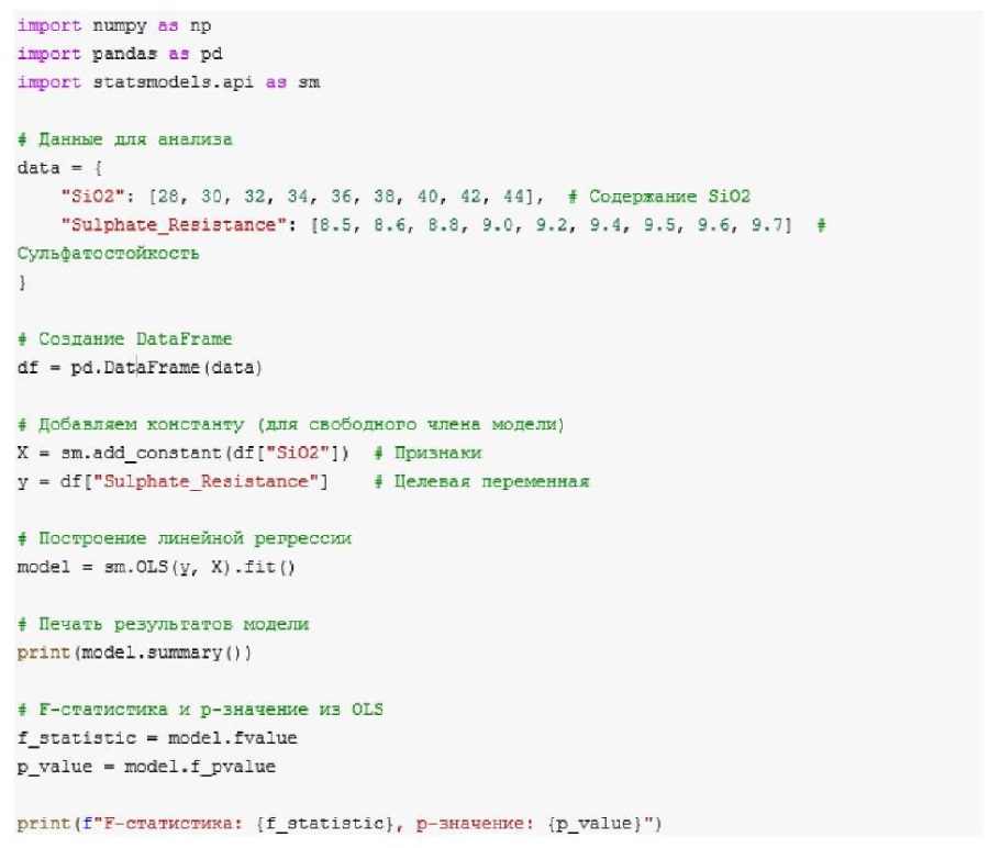 - construction of a regression model with calculation of coefficients, residual error and statistical parameters (F, p);