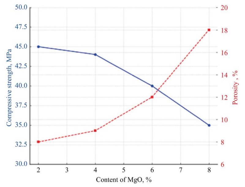 The graph shows how the MgO content affects the properties of cement. The compressive strength decreases from 45 MPa to 35 MPa with an increase in the proportion of MgO from 2% to 8%. Porosity increases from 8% to 18% with the same MgO range. This confirms the need to control MgO at a level of ≤ 5% to ensure high strength and low porosity.