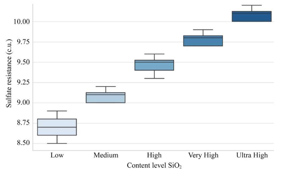 Results. The statistical significance of SiO2 influence on the sulfate resistance and strength of MCCs was proven (F = 248.6795, p = 3.5612e–25). The regression model (Sr = 6.2644 + 0.08 ∙ SiO2, R2 = 0.983) demonstrated a linear dependence of sulfate resistance (ranging from 8.04 to 9.62 conventional units) on SiO2 content (21–44%). For SiO2 content > 22%, the addition of pozzolans was recommended to compensate for reduced strength at early stages of hardening. Compressive strength ranged from 35.0 to 44.0 MPa. The reduction of C3A content to ≤8% enhanced sulfate resistance. The introduction of 50% granulated blast-furnace slag as a binder optimized the cement structure and reduced the carbon footprint by 27.5% (to 388.2 kg CO2/t). An increase in silica in the composition: