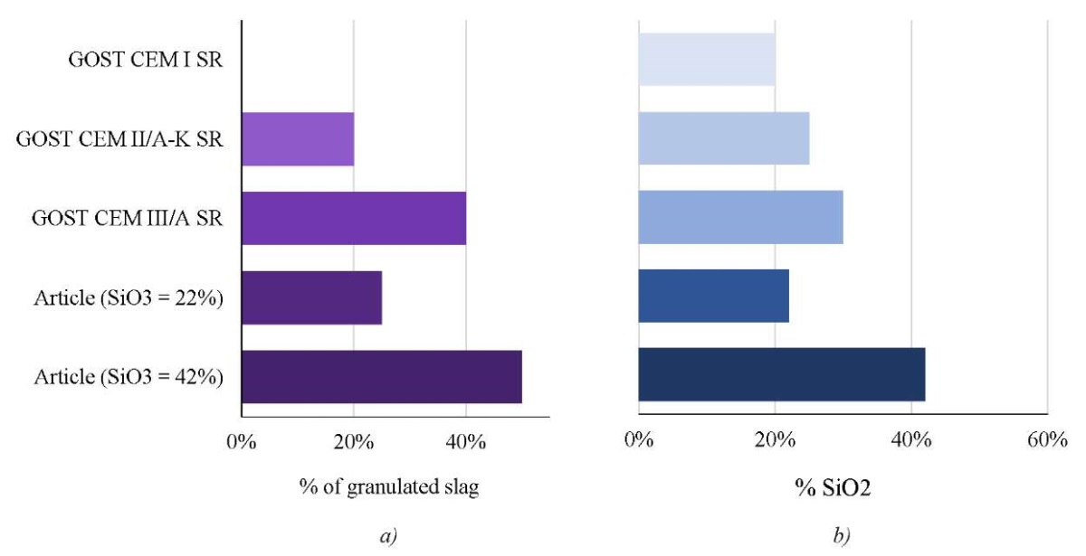 To achieve the maximum carbon footprint reduction, it is necessary to use slags with SiO2 > 40% and low CaO content to avoid excessive alkalinity. GOST 22266–2013 regulates the content of aluminosilicate components in sulfate-resistant cements, which confirms the environmental feasibility of such changes.