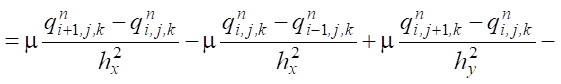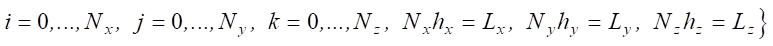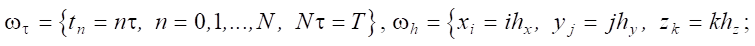 where τ — step in time, 0 ≤ t ≤ T; hx, hy, hz — steps in spatial directions; Lx, Ly, Lz — maximum size of the calculated area in space.