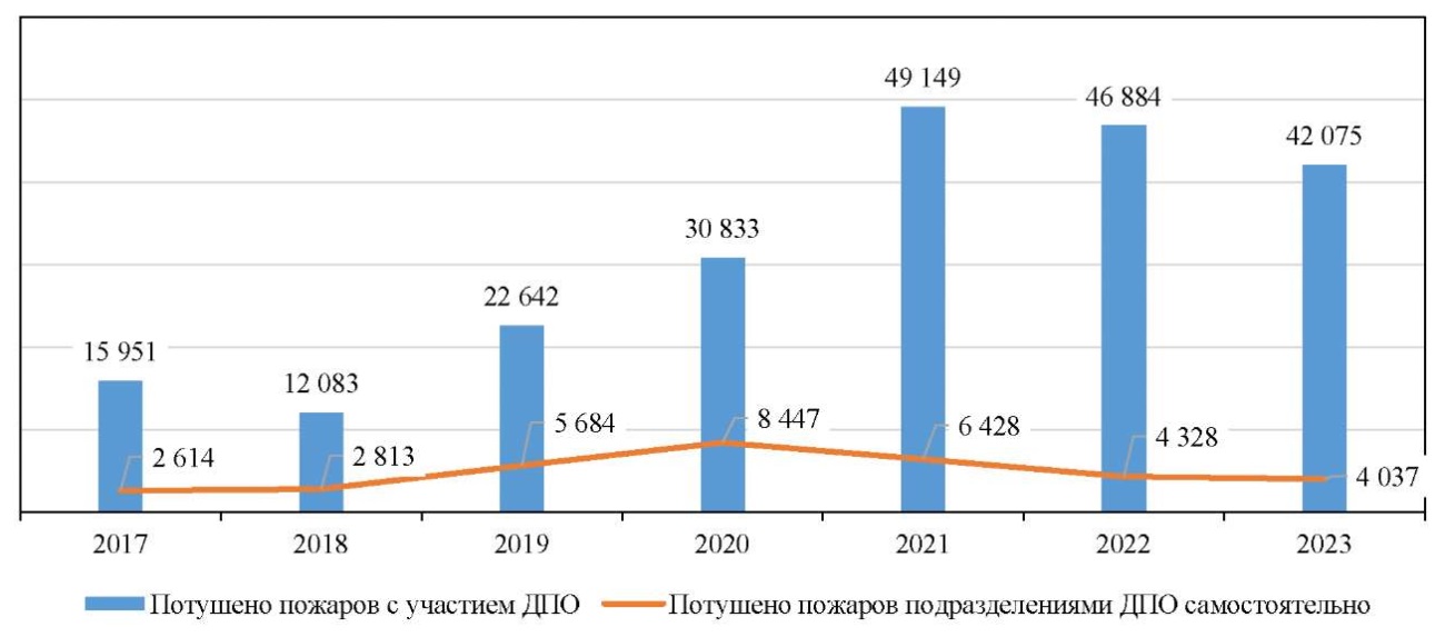 На основании данных рис. 1 видно, что количество пожаров, потушенных с участием ДПО, в период с 2017 по 2021 гг. увеличилось на 33 198 ед. (или на 208,12 %), с 2021 по 2023 гг. произошло снижение на 7 074 ед. (или на 14,4 %).