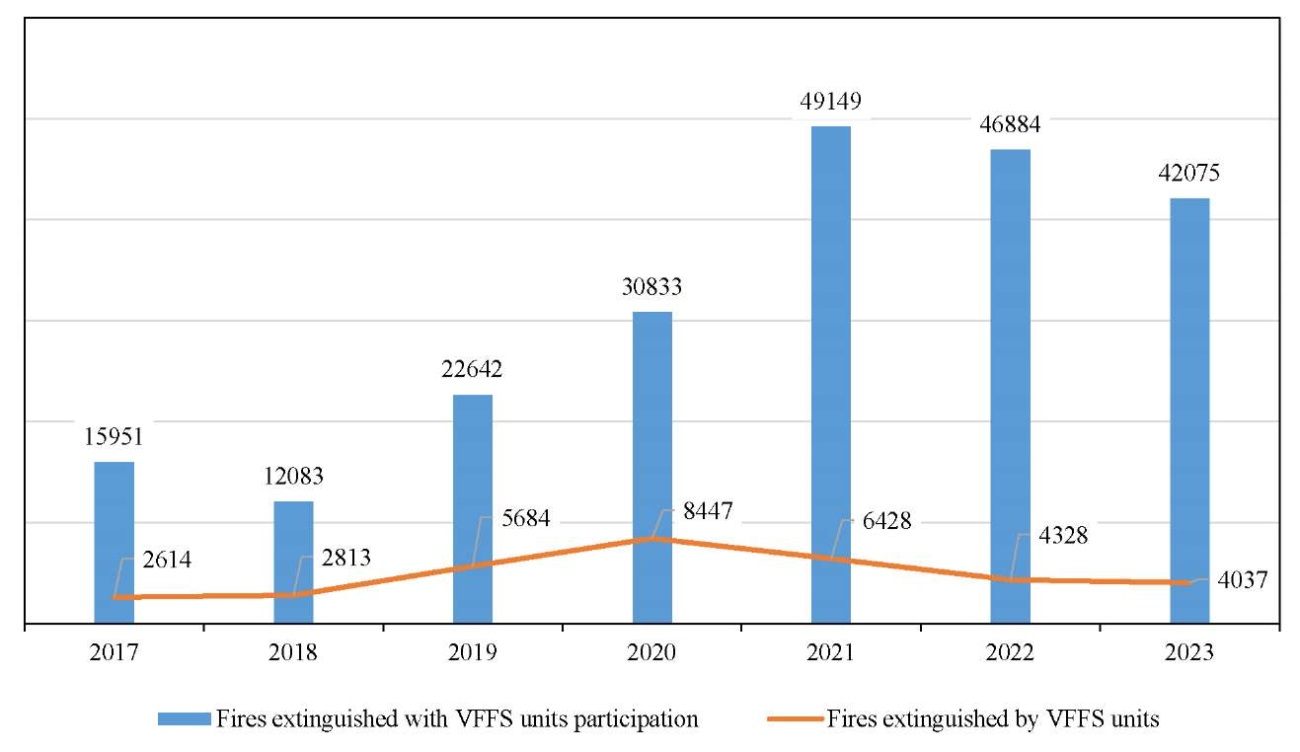 Based on the data in Figure 1, we can see that the number of fires extinguished with the assistance of VFFS increased by 33,198 units between 2017 and 2021, or by 208.12%. However, from 2021 to 2023, there was a decrease of 7,074 units, or 14.4%.