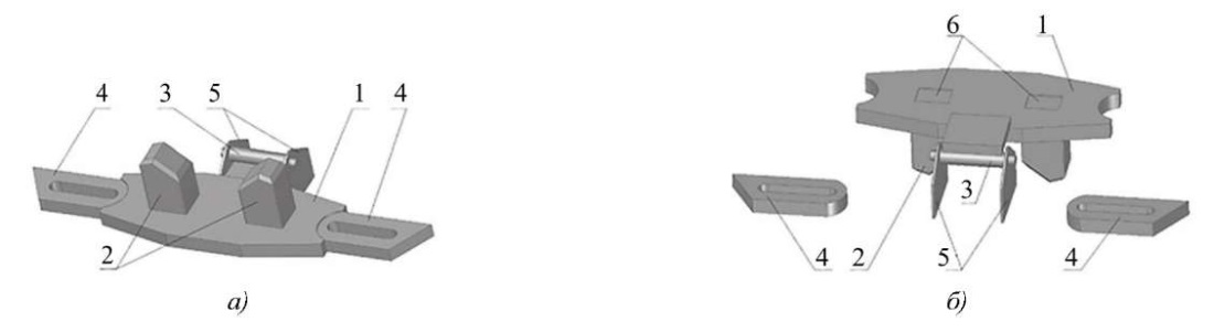 1 — основание упора; 2 — упор; 3 — палец; 4 — плита упора; 5 — петля основания; 6 — отверстия под упоры