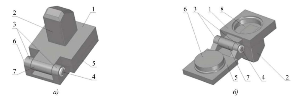 1 — основание упора; 2 — упор; 3 — петля основания; 4 — палец; 5 — плита упора; 6 — центрирующий выступ; 7 — петля упора; 8 — выемка под центрирующий выступ