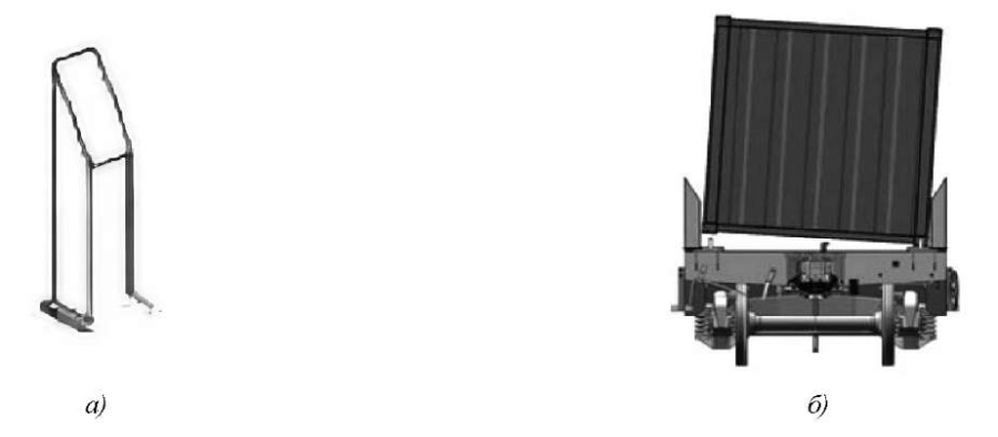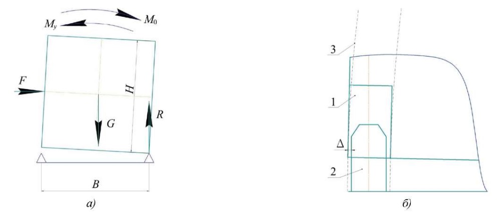 а — расчетная схема; б — зазор между фитингом и упором при опрокидывании;