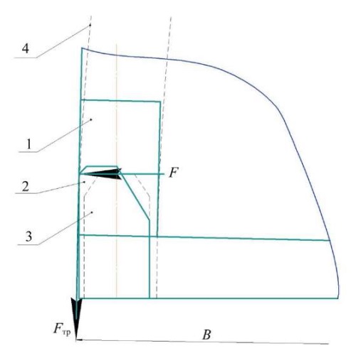 1 — отверстие фитинга; 2 — измененный упор; 3 — исходный упор; 4 — траектория движения при опрокидывании